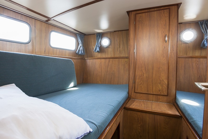 In der Achterkajüte finden Sie ein Doppelbett und ein Einzelbett mit Stauraum. Ebenso ist im Achterbereich ein getrennter Toilettenraum mit Waschbecken und ein separater Duschraum. Auf dem großen Achterdeck kann es sich die Crew auf den Deckstühlen bequem machen. Das Schiff hat 2 Steuerstände.