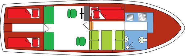Das Cabrioverdeck kann je nach Wetterlage geöffnet oder geschlossen werden. Im Vorschiff befindet sich eine gemütliche Dinette mit guter Aussicht nach draußen. Diese kann zu einem Schlafplatz für 2 Personen umgebaut werden. Gegenüber ist ein Etagenbett. Die Kabine im Heck hat zwei weitere Schlafplätze.Im Bug sind 2 weitere Schlafplätze vorhanden.
