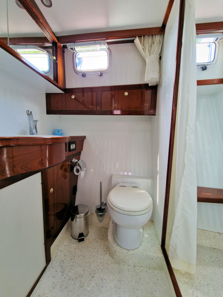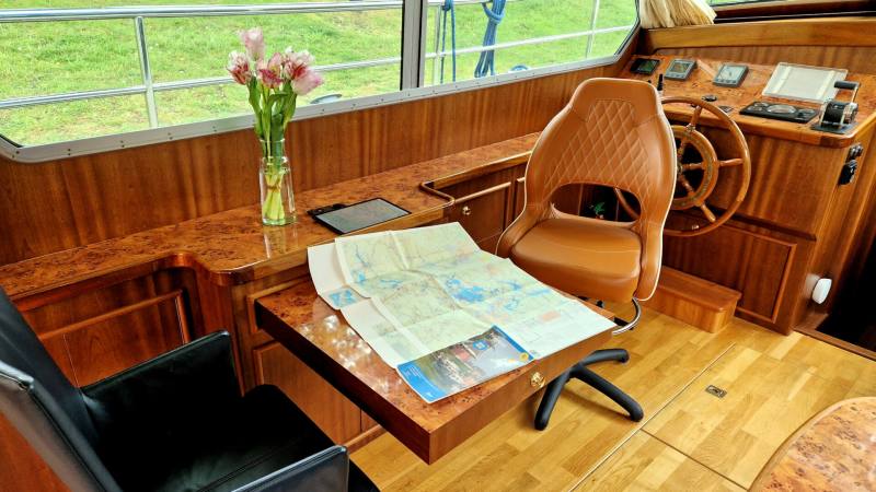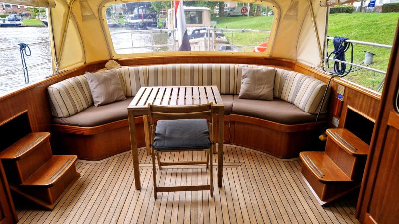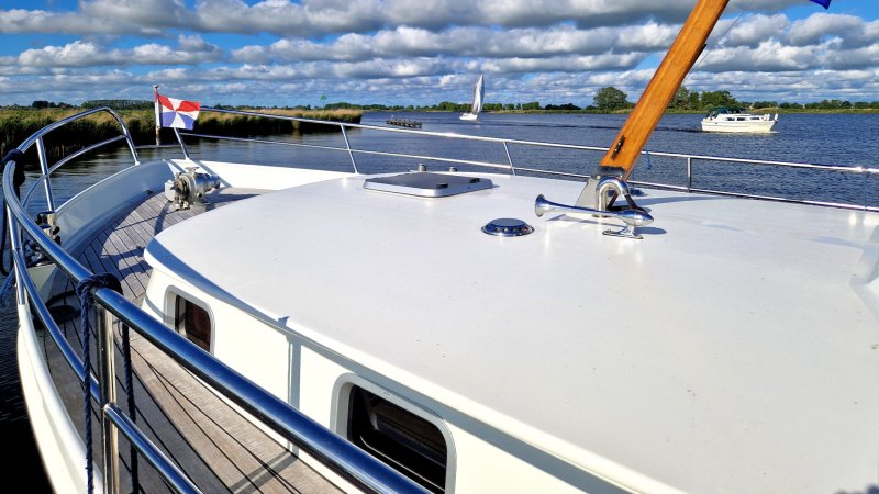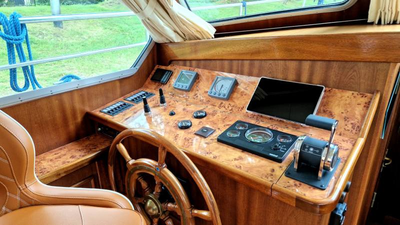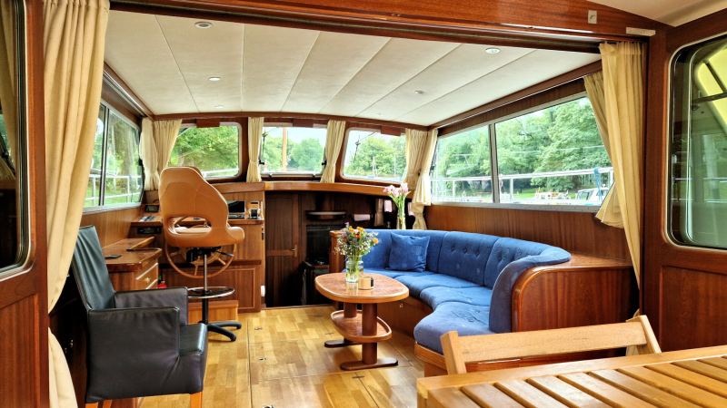 Es ist ein luxuriöses Schiff mit einer sehr schönen Linie, einer geringen Durchfahrtshöhe von nur 2,45 m und einem Teakholz-Boden an Deck.
