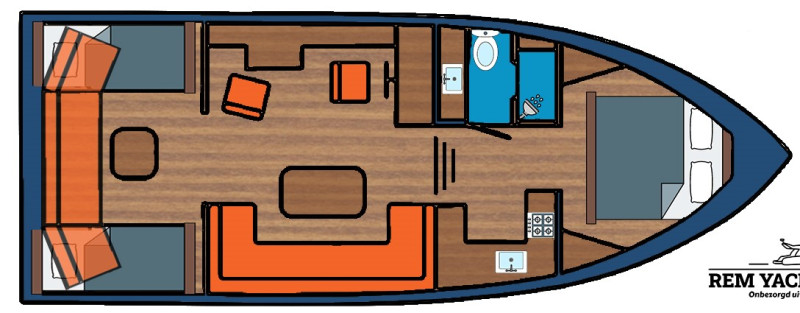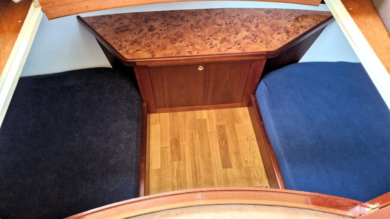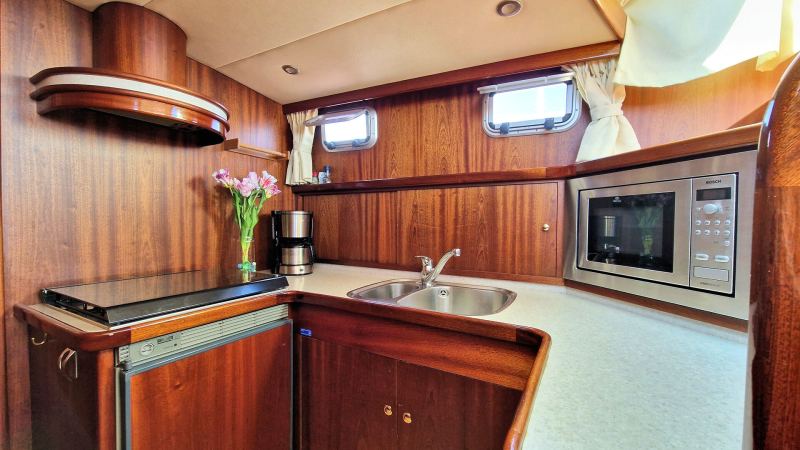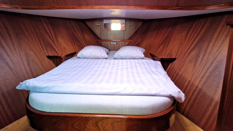 Das Boot verfügt über große Fenster, Falttüren und allen Komfort für einen langen Aufenthalt an Bord. Die hintere Schlafkabine erreicht man, indem man auf dem Achterdeck die Sitzbank zurückschiebt und durch eine Luke hinuntersteigt.